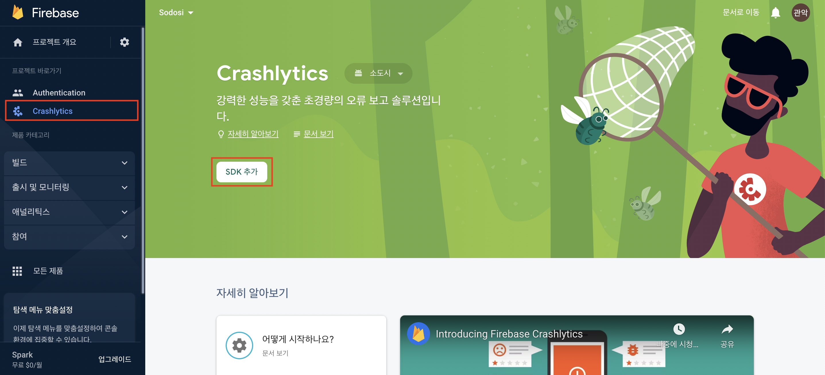 Firebase Console에서 Crashlytics 메뉴로 들어가보면 이런 화면이 뜬다. 여기서 ”SDK추가” 버튼을 누르면 공식문서로 이동하는데, 해당 내용을 참고해서 프로젝트에 라이브러리를 import해주면 끝!