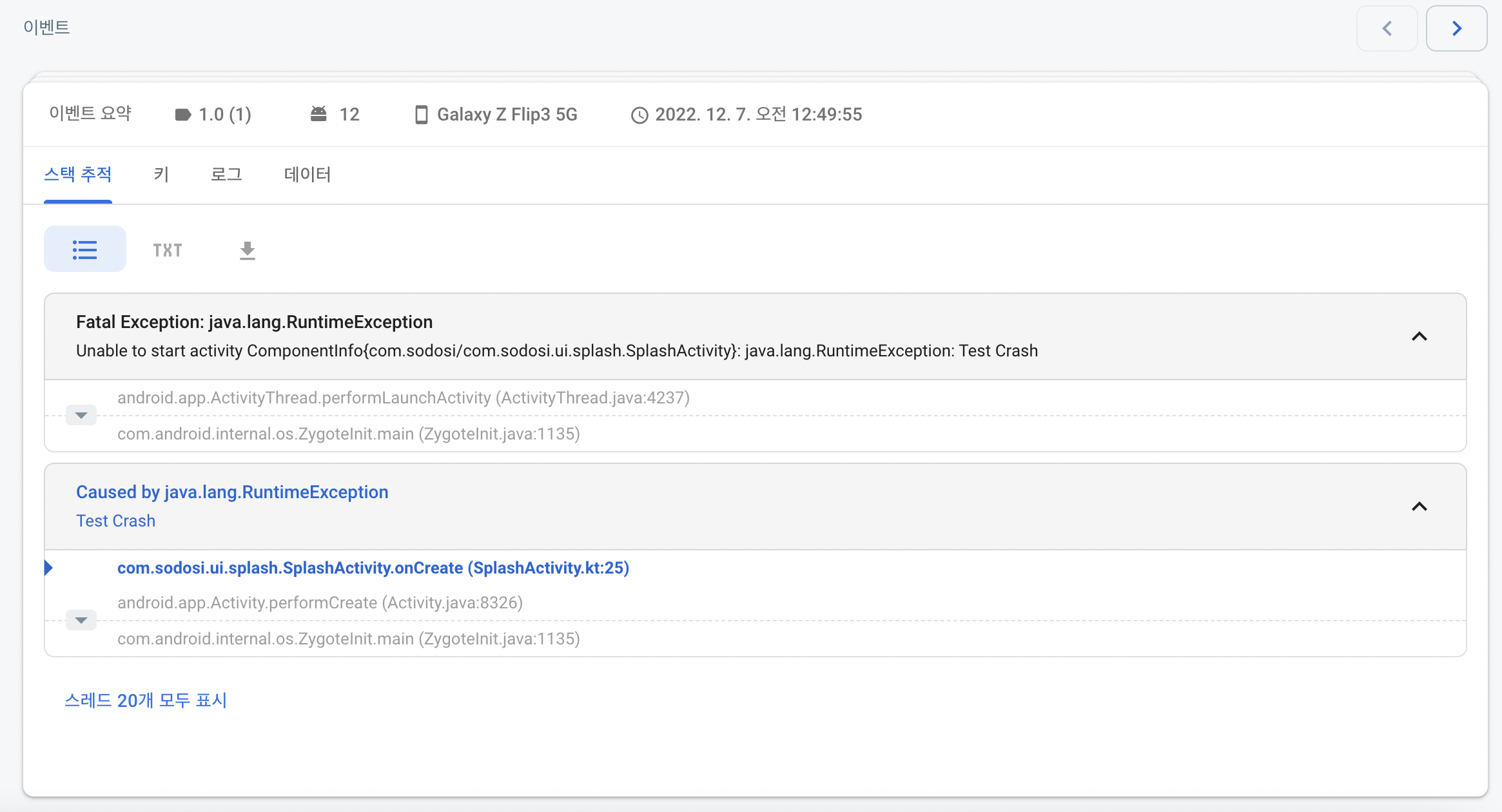 이렇게 코드로 테스용 크래시를 발생시켜준다. 실제 상황에서는 NullPointerException이나 IndexOutOfBoundsException.. 등의 에러가 발생할 수 있을것이다. 위와 같이 강제로 크래시를 발생시키는 코드를 넣고 앱을 실행시키면, 앱이 죽게 되고 파이어베이스 콘솔에는 "Test Crash"라는 에러 기록이 남을 것이다 🌟
